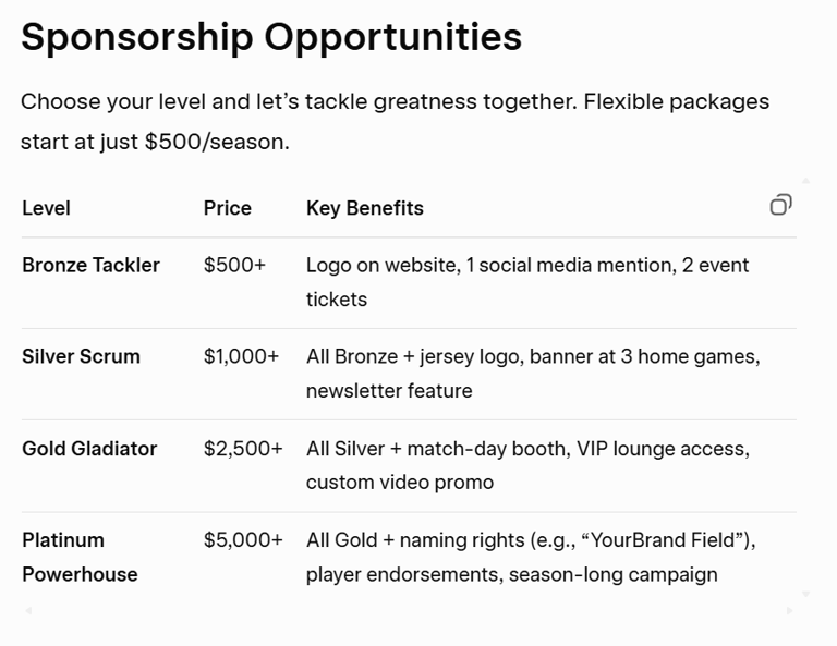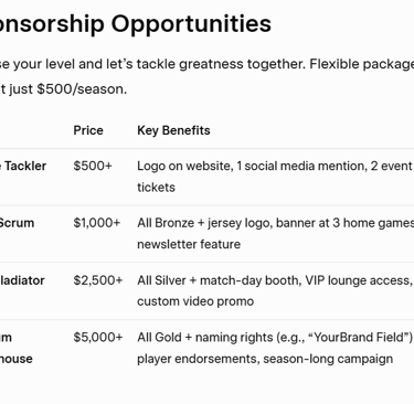 Prime Visibility: Logo on jerseys, banners at home games (5,000+ attendees per season), website features, and social media shoutouts reaching 10,000+ followers.